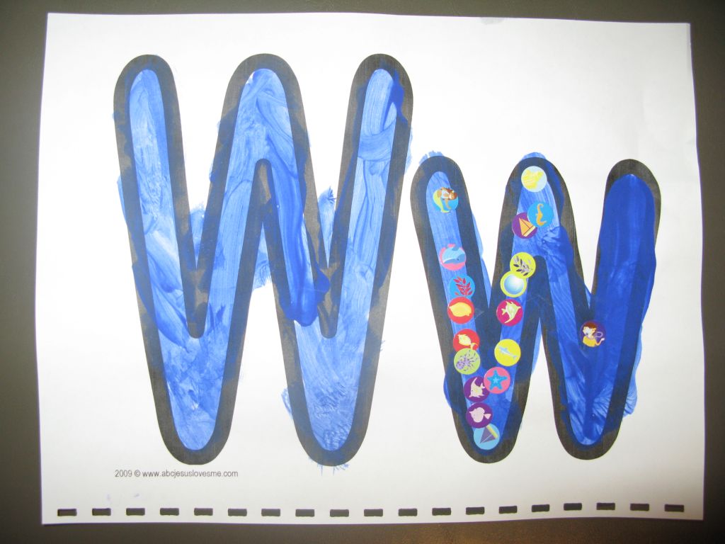 Two weeks ago, W was Letter of the Week. After printing off the Letter W Poster, I sat down with the kids and brainstormed words that start with /w/. They came up with great ones. Then we talked about how we could decorate the W Poster to demonstrate that word.
