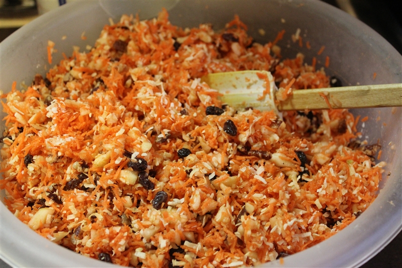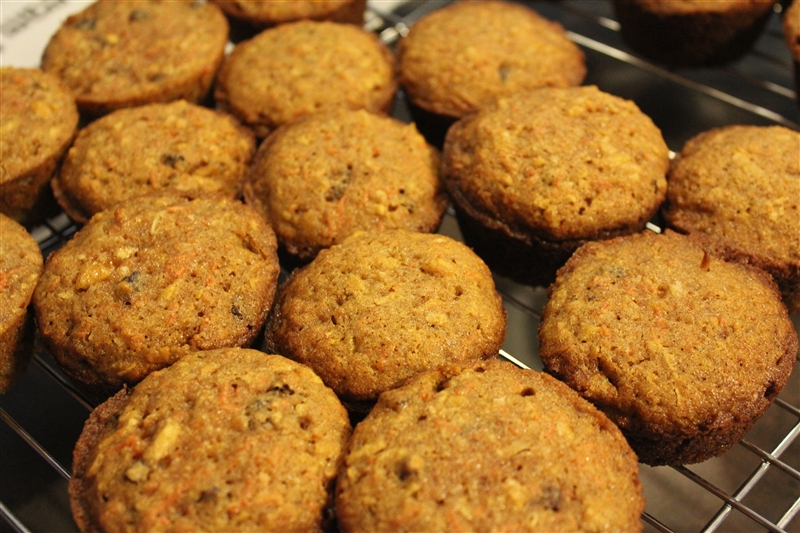 Add egg mixture to carrot mixture. Stir well. Add dry ingredients but don’t over stir. Place in muffin tins. Makes 24 muffins.