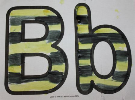 Butterfly:– Print 2 copies of the Bb Poster. Color and cut around the uppercase letters (one uppercase B will need to be colored on the wrong side). Tape two uppercase B’s together (one backwards and forwards) to make butterfly wings. Glue pompoms down the center to create a butterfly. Add a pipe cleaner for the butterfly’s antenna. Thank you Shannon for this idea!– Draw butterflies or place butterfly stickers or stamps on the Bb Poster.