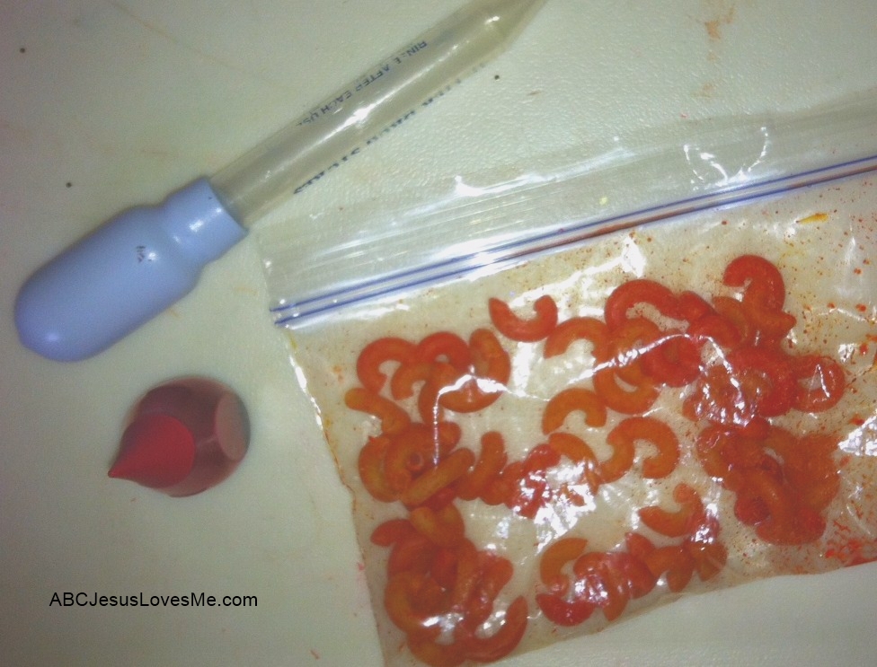 Place a handful of macaroni in a zip top bag.  Add a pinch of vinegar to the sack and a few drops of food coloring.  Zip close the bag making sure the air is all out and mix.  Once the dropping is filled with the vinegar, a preschooler should be able to do much of this on their own, with supervision of course.