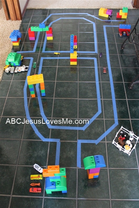Transportation is one of the units in the 5 Year ABCJesusLovesMe Preschool Curriculum. So, Little Man, Sweet Pea, and I built a road system using painter’s tape (do not use masking tape as it will leave a residue). With a basic figure-eight setup, we made three exits to visit various places.