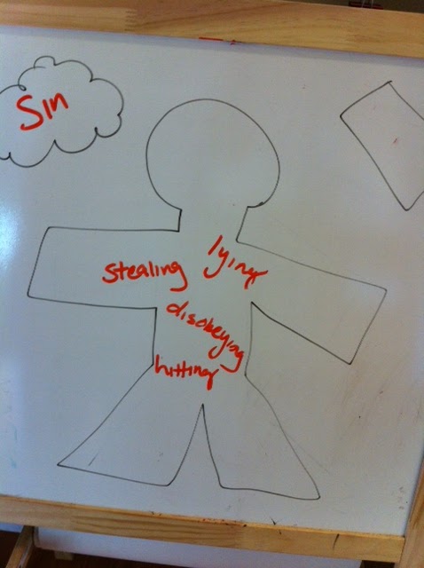 To illustrate the point, I drew a child on a whiteboard. Then we discussed how sin is something that can cloud our hearts and separate us from God. The kids provided examples of sins, which we drew on the figure.