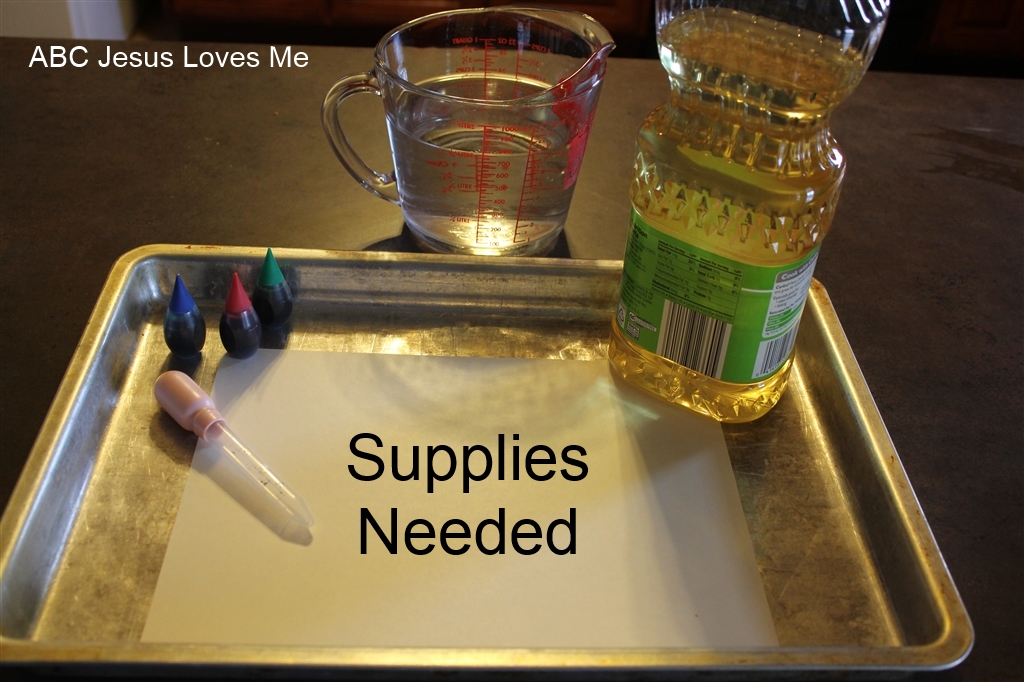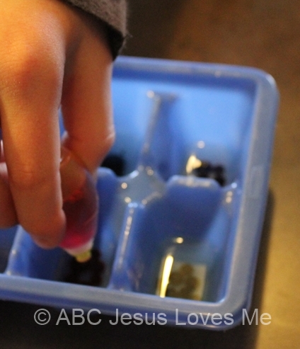 2. In a small container, pour about 1/2 Tablespoon of oil. Add approximately 1 teaspoon of food coloring. Notice how the two do not mix. (Oil/water concept) We used an ice cube tray as we made several colors. Beat the oil and coloring together. This will take a little bit as the two don’t want to mix.